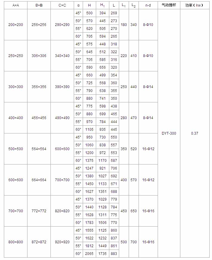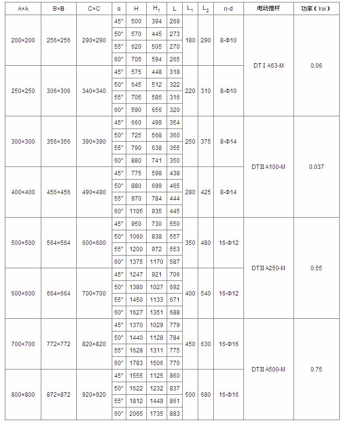 | A×A | B×B | C×C | α | H | L | L1 | L2 | n-d | 電動裝置 | 功率(kw) |