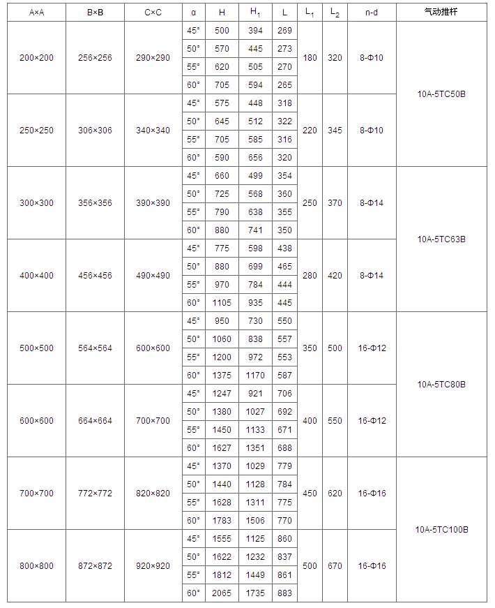 | 200×200 | 256×256 | 290×290 | 45° | 267 | 177 | 180 | 220 | 8-Ф10 | DKJ-210 或 OA-10 | 0.025 |